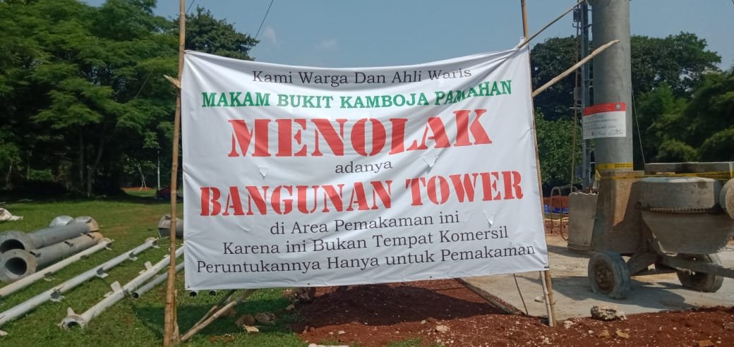 Pantauan awak media rabu 5/06/24, Spanduk dengan ukuran besar ini dipasang ditengah area Makam Pamahan dengan judul ” Kami Warga Dan Ahli Waris Makam Bukit Kamboja Pamahan Menolak Dengan Adanya Bangunan Tower di Area Pemakaman ini, Karena ini Bukan Tempat Komersil, Peruntukkannya Hanya untuk Pemakaman,” demikian tertulis dalam spanduk itu.