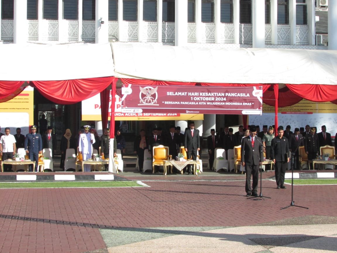 Pada kesempatan tersebut, Asisten III Sekda Aceh Dr. Iskandar AP., menjadi Inspektur Upacara sekaligus membacakan langsung Teks Pancasila.