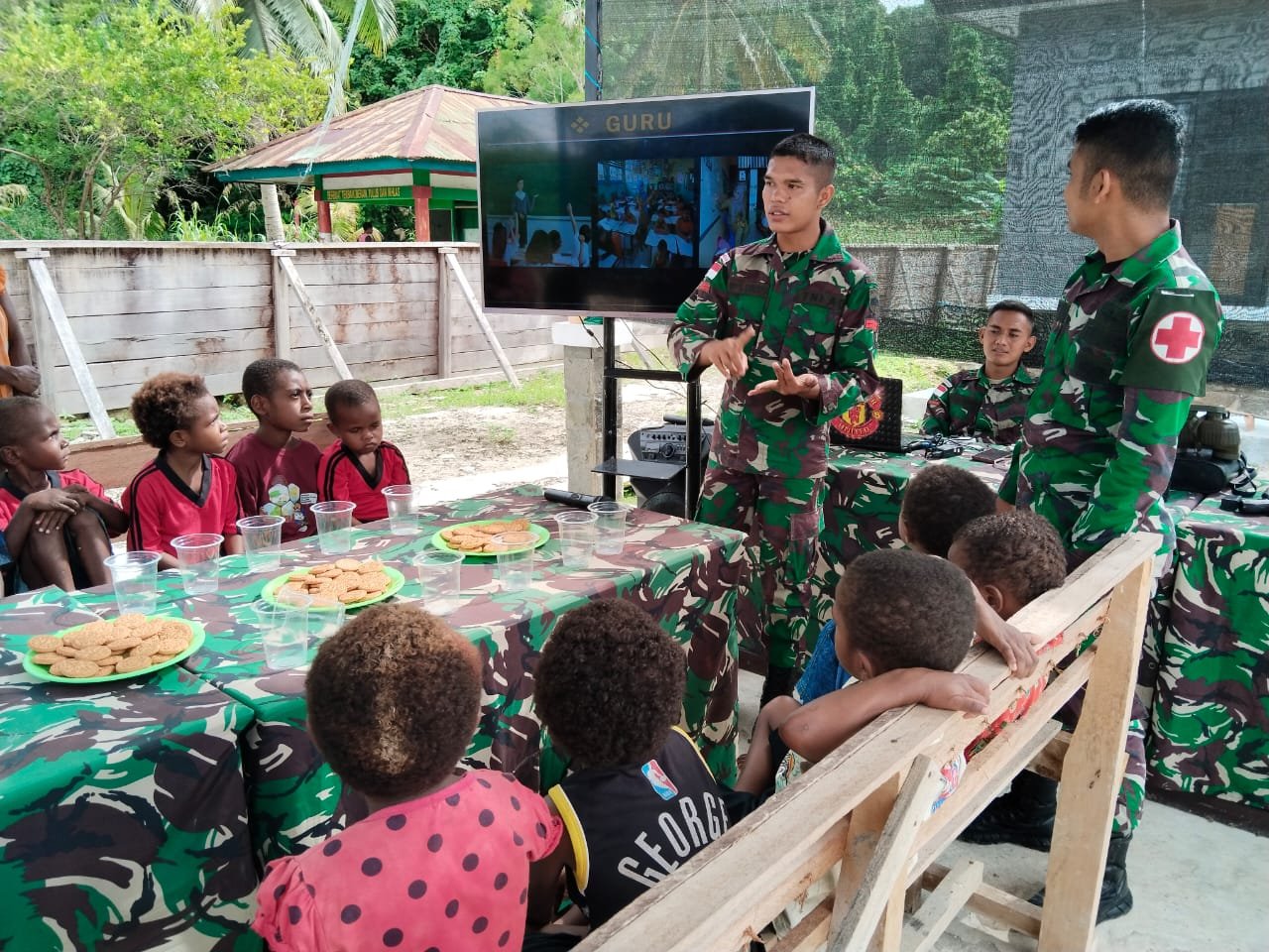 “Tak hanya memberikan pengajaran saja, prajurit juga memberikan formula dan biskuit sebagai ekstra puding untuk tumbuh kembang para murid PAUD Florensia di Kampung Mosso,” ucap Danpos.