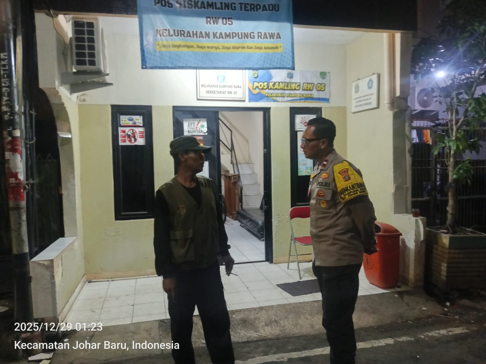 Kegiatan sambang Pos Satkamling RW 05 Kelurahan Kampung Rawa dilaksanakan pada Senin, 29 Desember 2025, pukul 01.30 WIB, bertempat di Pos Kamling RW 05, Jalan Rawa Selatan 2 RT 14 RW 05, Kelurahan Kampung Rawa, Kecamatan Johar Baru, Jakarta Pusat.